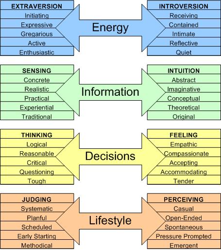 The MBTI helps an individual understand his/her personality preferences. In the chart below, the middle column lists the four dichotomies with the left and right columns listing the eight areas of comfort, or preferences for an individual. Each of these eight areas has a letter assigned. For example, Extraversion is the letter E and Introversion are the letter I. Once the person chooses his/her preference in each category, their personality type is represented by a combination of the codes, for example, ESFP would be a combination of Extraversion, Sensing, Feeling and Perceiving. The MBTI has a description for each of the 16 personality types to help the individual understand more about his/her personality preferences.